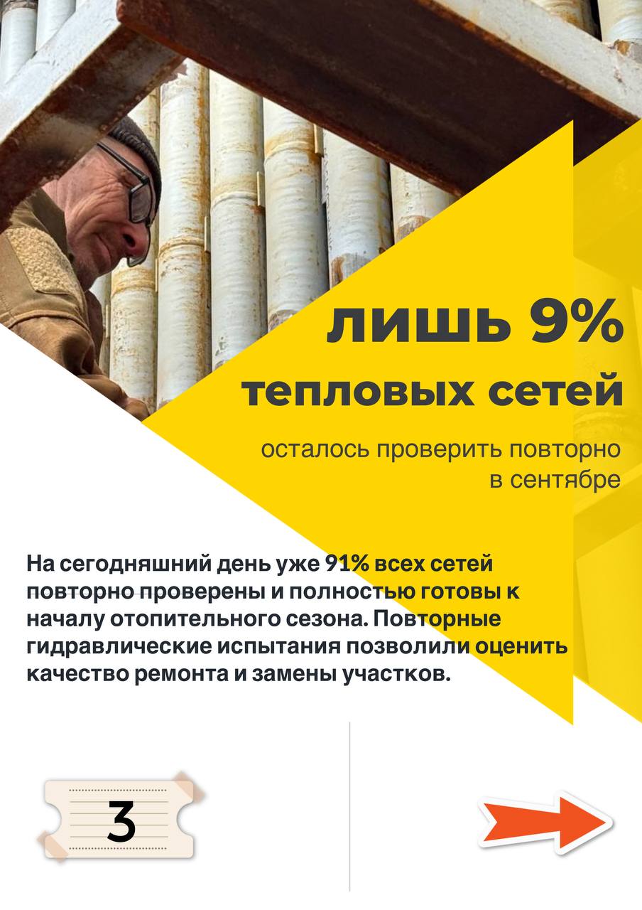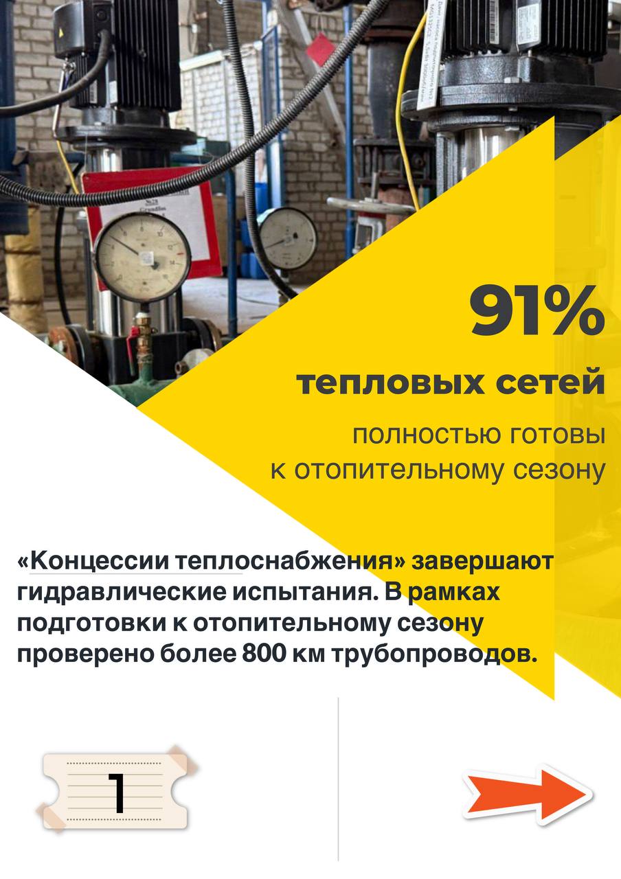 После выполнения всех восстановительных работ проведены повторные гидравлические испытания, которые подтвердили готовность систем. На текущий момент 91% всех тепловых сетей города полностью подготовлены к началу отопительного сезона. Оставшиеся 9% сетей пройдут повторные испытания на прочность в сентябре.