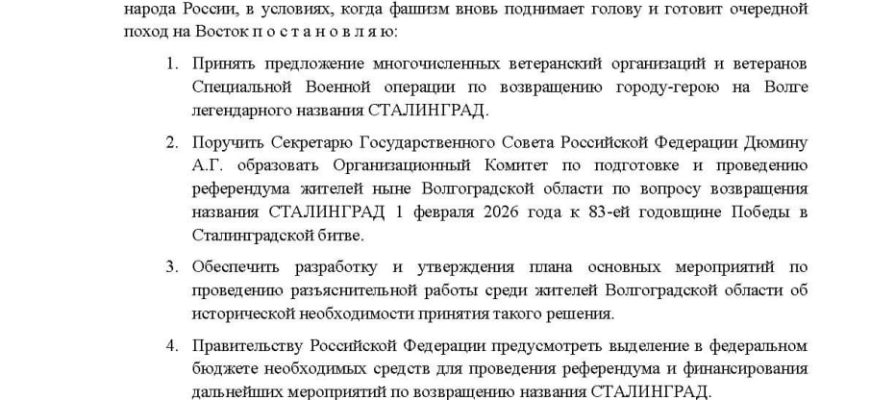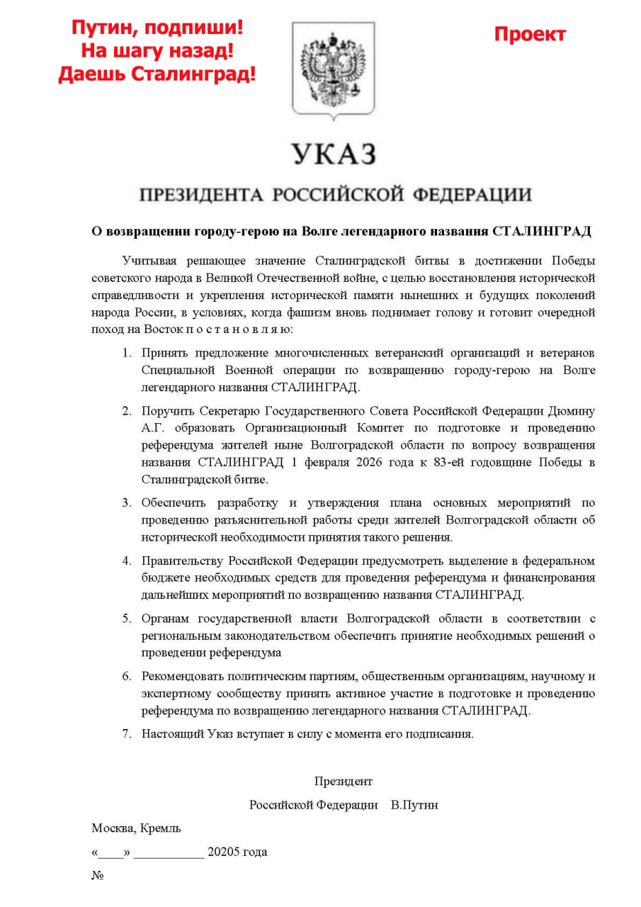 Активисты организации “Военный Совет Сталинградского фронта” выступили с требованием к президенту России подписать указ о возвращении городу-герою на Волге исторического названия Сталинград. Общественники настаивают на проведении референдума среди жителей области по вопросу переименования и уже подготовили соответствующий проект документа.