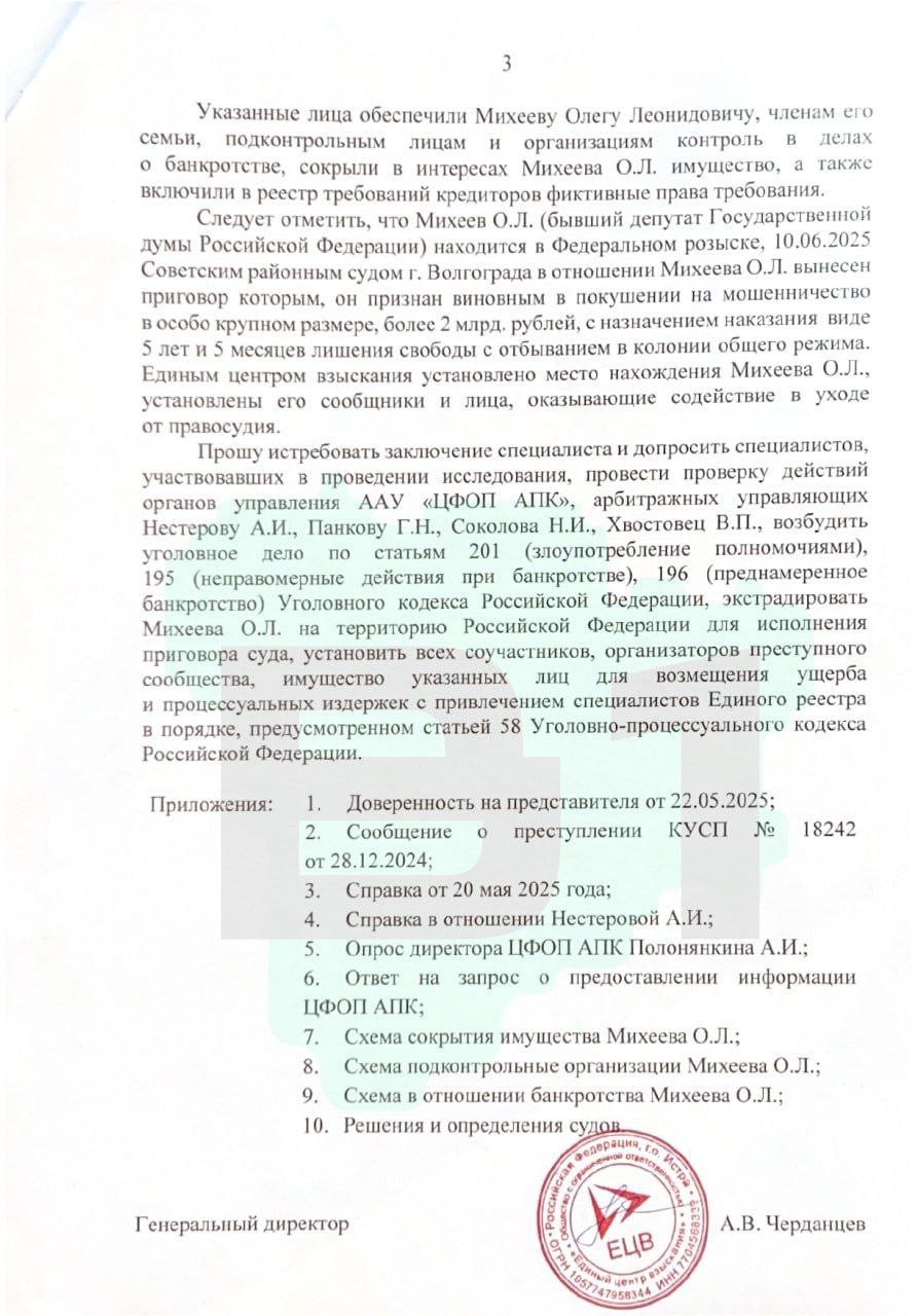 Продолжаются судебные процессы по делу бывшего депутата Государственной думы от Волгоградской области и предпринимателя Олега Михеева. Стало известно, что он получил отказ в апелляционной жалобе. Суд оставил в силе первоначальное решение — 5,6 лет лишения свободы за мошенничество на сумму 2 миллиарда рублей. В настоящее время Михеев находится за пределами России.
