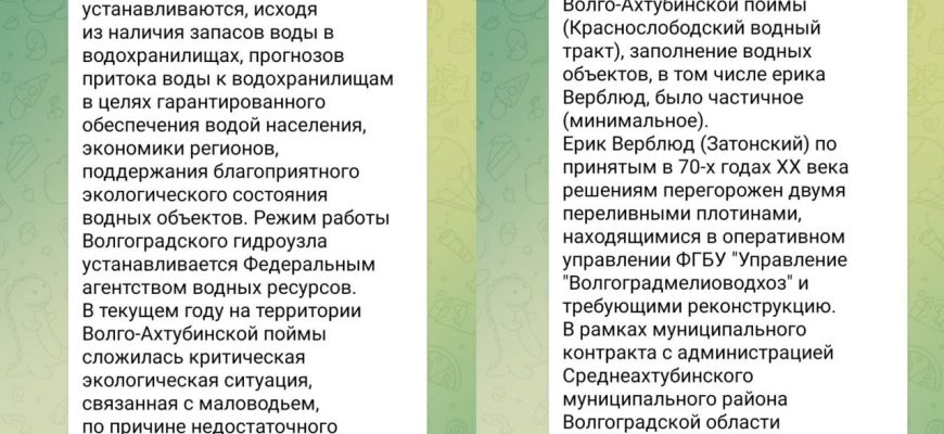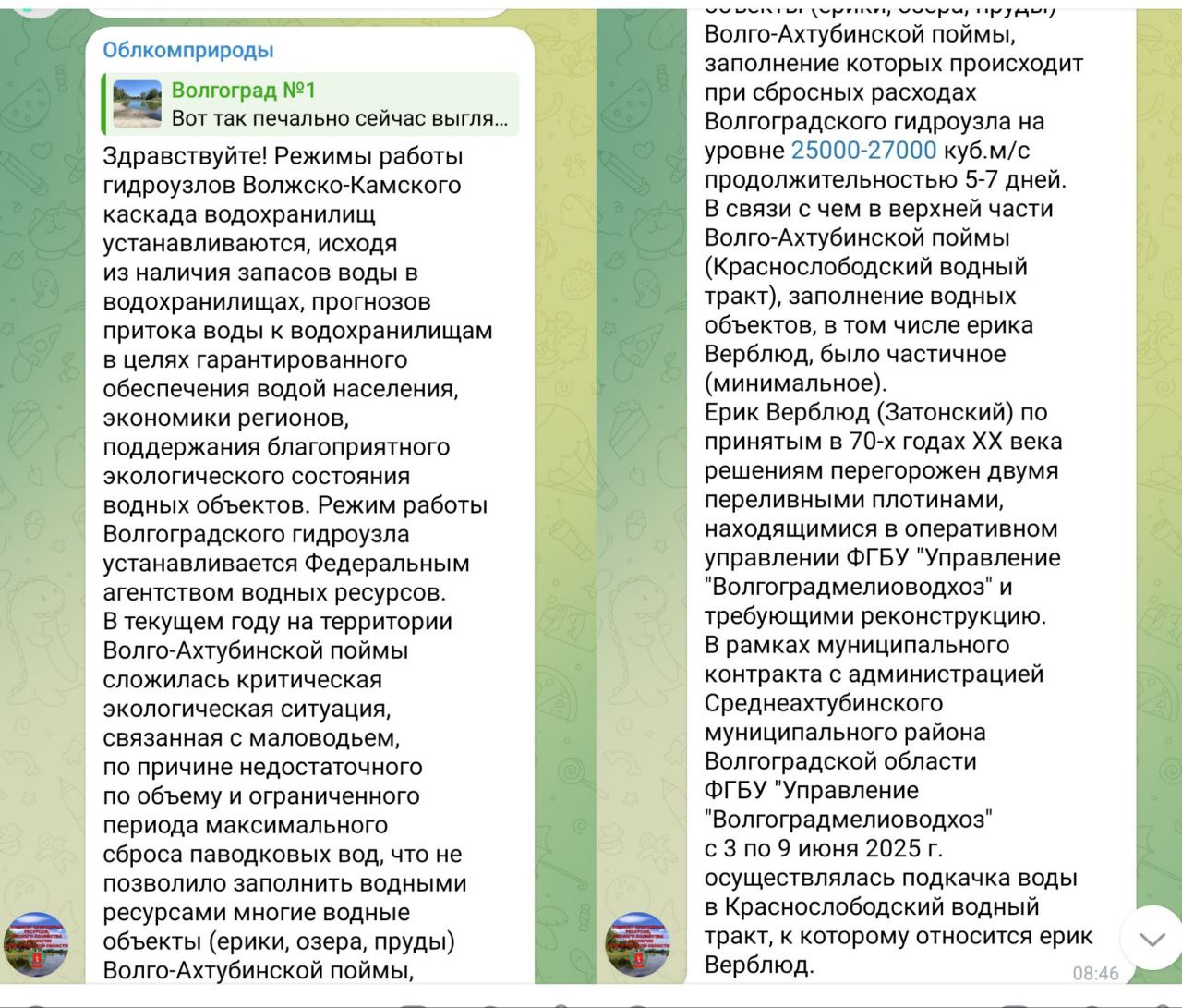 Также было отмечено, что с 3 по 9 июня управлением «Волгоградмелиоводхоз» осуществлялась подкачка воды в Краснослободский водный тракт, к которому относится ерик Верблюд.