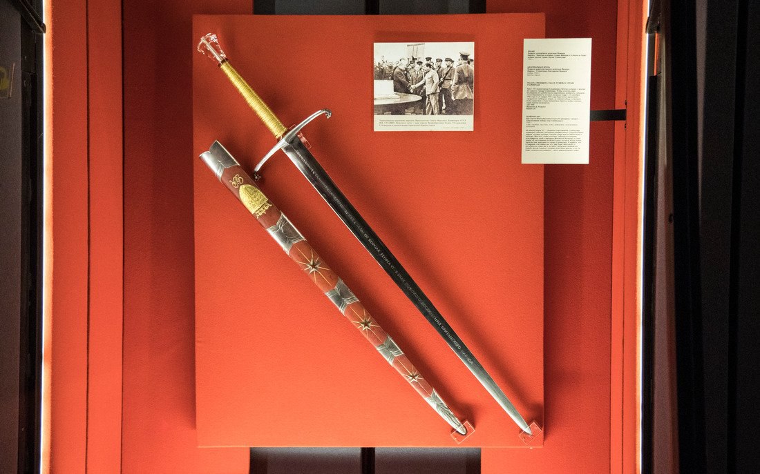 Этот меч был подарен Сталину премьер-министром Великобритании У. Черчиллем в ноябре 1943 года на Тегеранской конференции в знак глубокого восхищения героизмом защитников Сталинграда. С тех пор меч почти не покидал музея и экспонировался в других странах и городах всего несколько раз.
