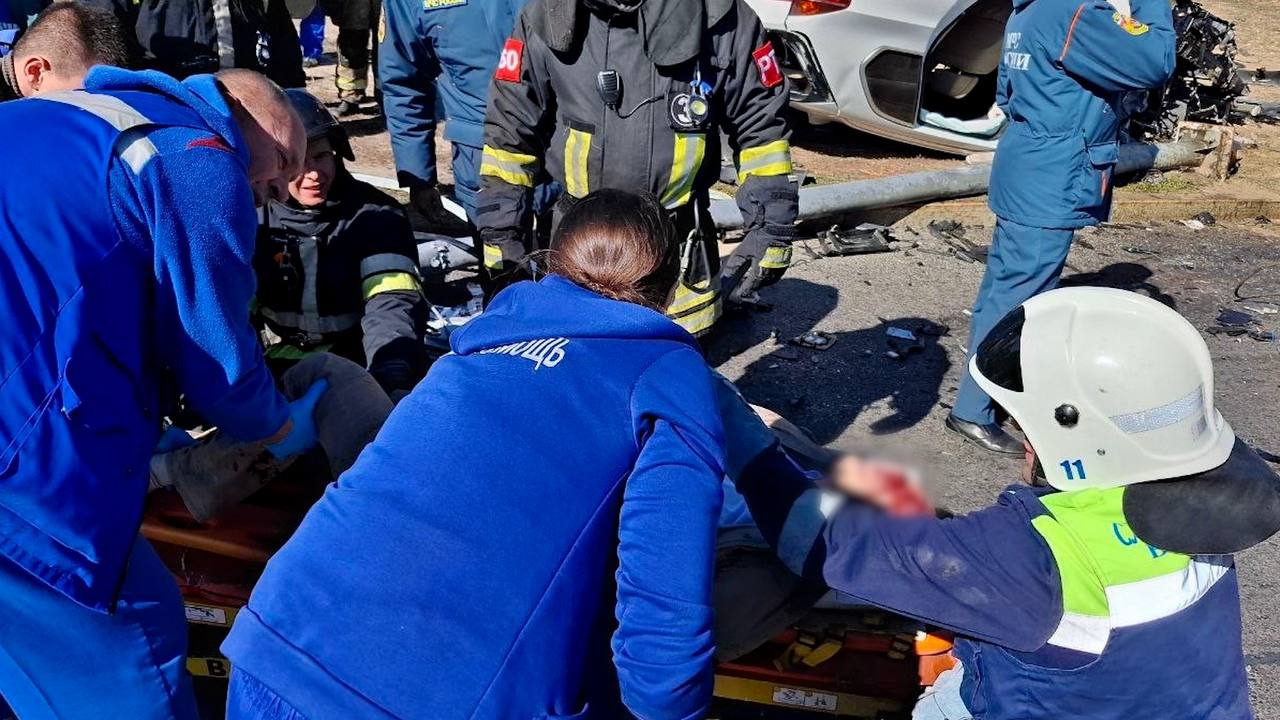 Специалисты МЧС в настоящее время оказывают необходимую помощь пострадавшим и работают над освобождением людей из поврежденного автомобиля.