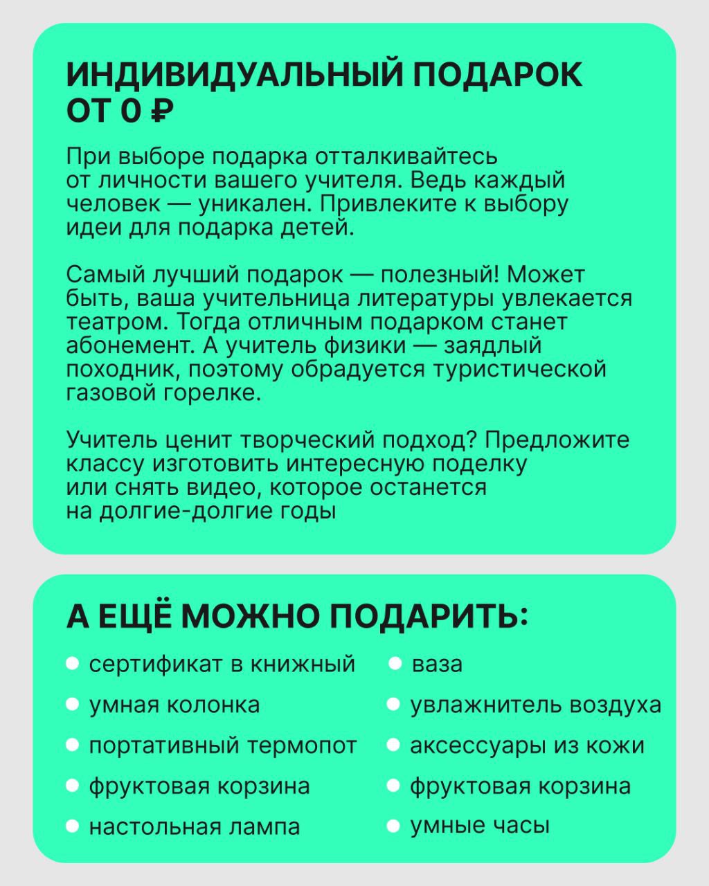 Давайте признаем: многие учителя подустали от цветов. А неиссякаемые запасы конфет и чая у некоторых педагогов уже не помещаются ни в квартире, ни в классе.