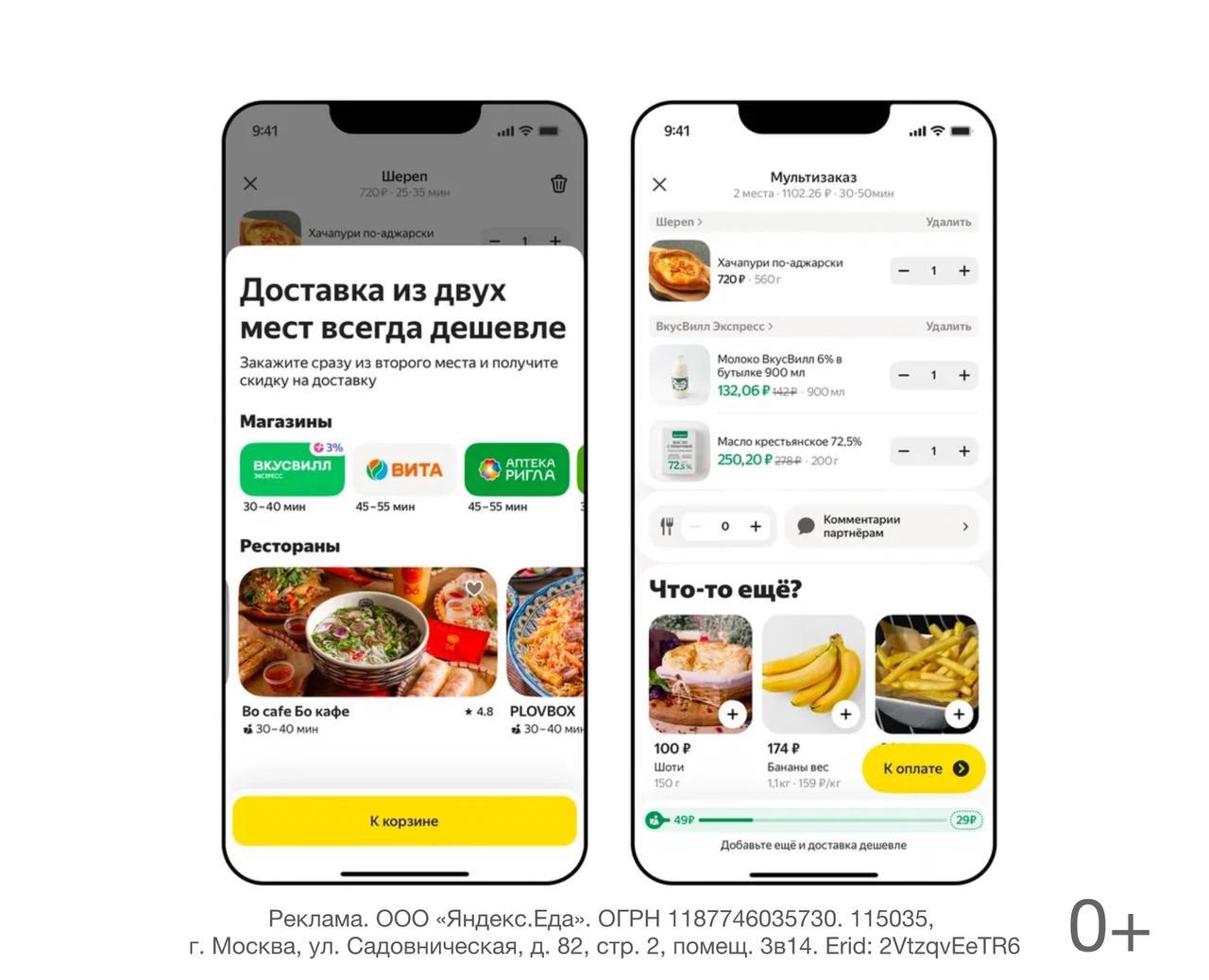 Функция будет полезна, например, для заказа блюд из двух ресторанов для компании с разными предпочтениями или для одновременной покупки продуктов и лекарств. Объединить можно заказы из двух магазинов, двух ресторанов или комбинации магазина и ресторана, при условии, что они расположены недалеко друг от друга.